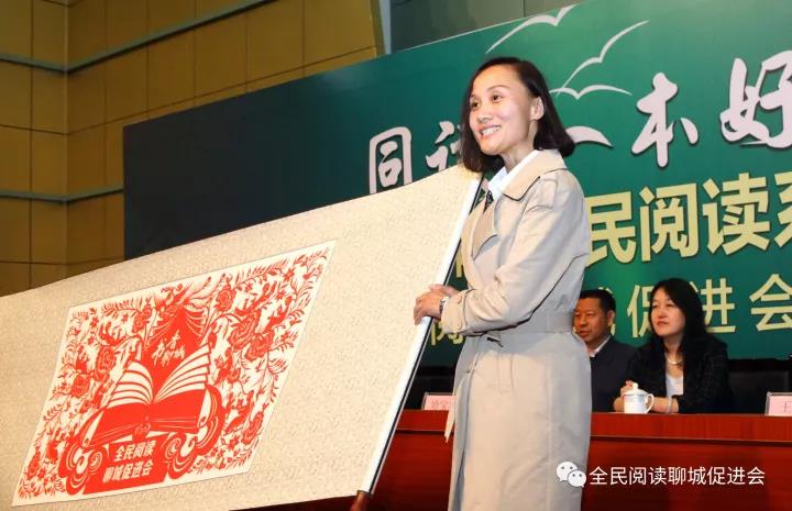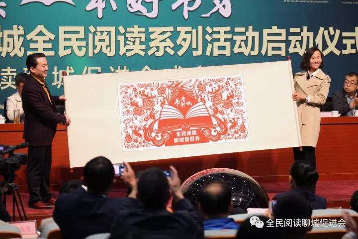 书香聊城全民阅读系列活动自筹备以来,吸引社会各界纷纷高度关注,积极加入推动我市全民阅读促进工作的队伍中来,聊城市剪纸学会向活动组委会馈赠《书香聊城》创意剪纸作品,该作品由我市非物质文化遗产剪纸项目代表性传承人梁颖女士设计创作,聊城市文化创意产业协会会长吴庆豹代表组委会接收。