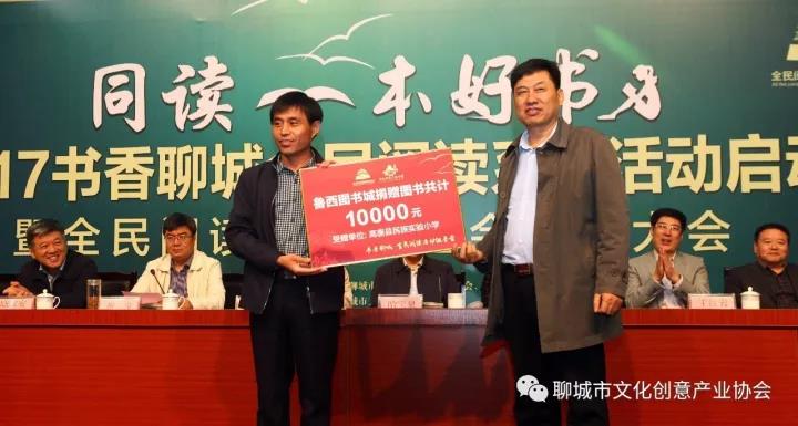 聊城市文化创意产业协会会长、康华传媒董事长吴庆豹向临清市武训实验小学、冠县东街第一小学、莘县第二实验小学、阳谷县实验小学、东阿县实验小学、茌平县实验小学校领导代表授赠书牌