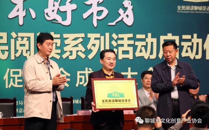 系列活动一:全民阅读聊城促进会成立揭牌仪式,中共聊城市委宣传部副部长赵昌军,市教育局党组书记、局长哈宝泉共同揭牌;