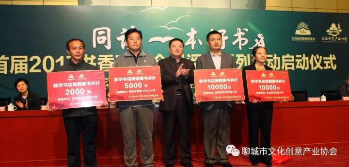 系列活动二:书香聊城全民阅读图书捐赠公益行启动,全民阅读,从小学生开始,为向小学生推荐优秀传统文化书籍,组委会联合新华书店、鲁西图书城、康华传媒共同向东昌府区北顺小学、临清市武训实验小学、冠县东街第一小学、莘县第二实验小学、阳谷县实验小学、东阿县实验小学、茌平县实验小学、高唐县民族实验小学、开发区东城小学、高新区顾官屯中心小学、度假区周店小学全市十一所学校捐赠图书共计110000元。
